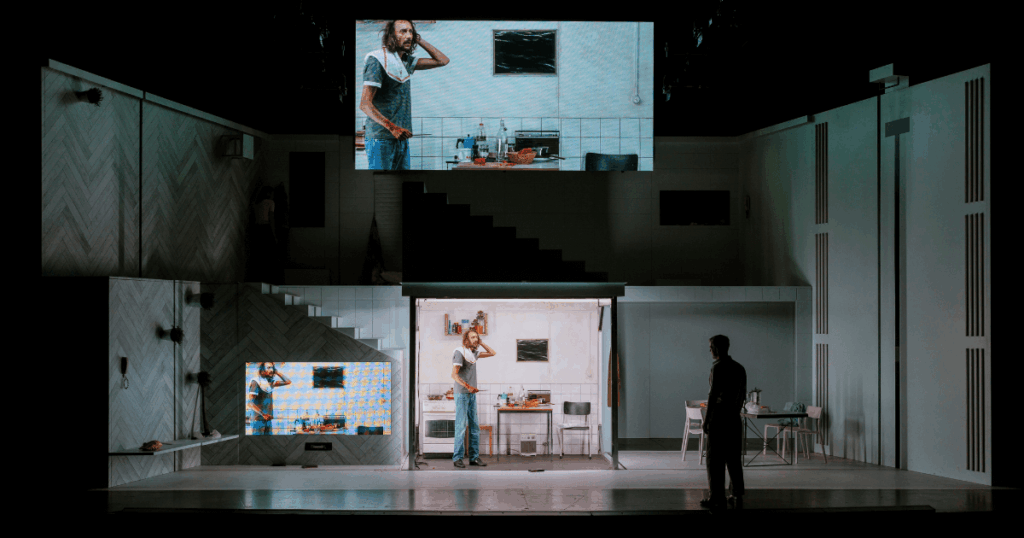 Das Stück findet nie nur an einem Ort auf der Bühne statt. Auf bis zu drei Bildschirmen und Leinwänden wird gleichzeitig das Geschehen wiedergegeben. Manchmal zeitversetzt, manchmal nur ein Ausschnitt. Die Figuren sind nie unbeobachtet. Doch auch das Publikum ist nicht sicher vor Überwachung, wenn es an einem Punkt durch eine versteckte Kamera auf der Bühne gefilmt wird.