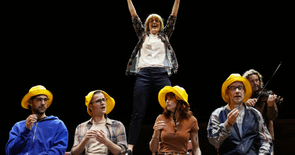 Diese “girl math”-Methode à la Musicalproduktion zieht sich auch durch die Besetzung des Casts. Für ca. 40 Charaktere braucht man nur 13 Schauspieler*innen. Die Flugkapitänin Beverley (gespielt von Sanne Mieloo) wird ohne Jackett, dafür mit Blumenweste zur Lehrerin Annette. David Rodriguez-Yanez, der gerade noch einen Polizisten aus Gander gespielt hat, wird kurzerhand zum Rabbi.