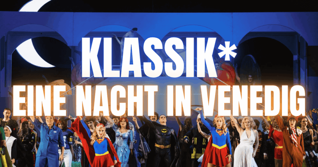In Nina Spijkers’ Inszenierung der Strauss-Operette “Eine Nacht in Venedig” an der Volksoper Wien treffen Operetten-Tradition und moderne Popkultur aufeinander. Zwischen politischen Anspielungen, Superheldenkostümen und menschengroßen Fischen entsteht ein buntes Chaos aus Täuschung, Lust und Party.