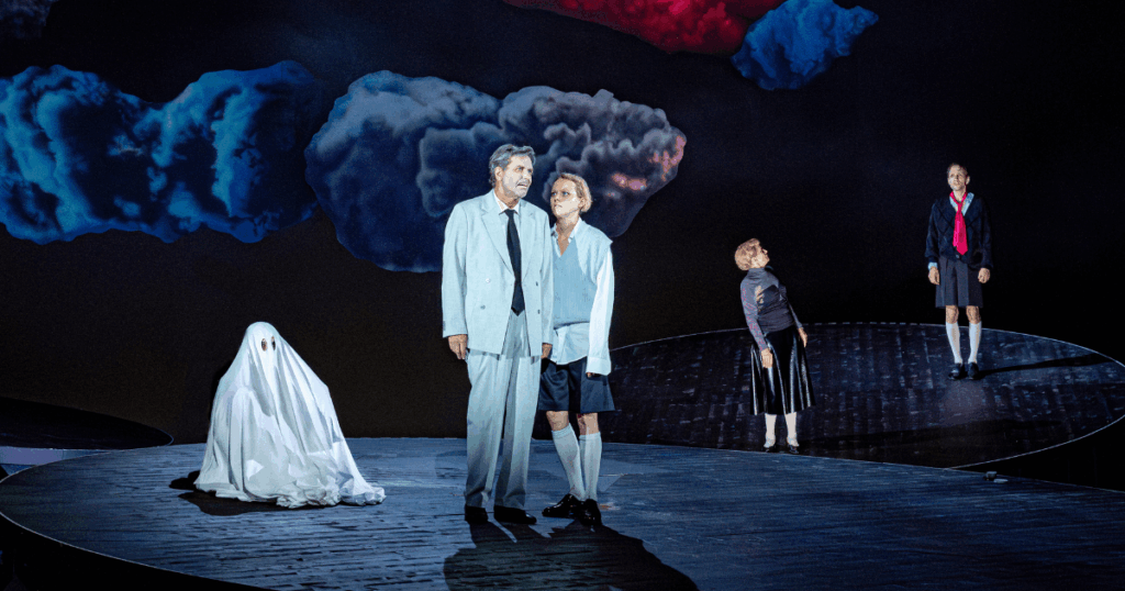 Ok, also da passiert schon sehr viel in den 2 Std und 30 Minuten. Und es wuseln nicht nur viele königliche Geister über die Bühne und den Zuschauerraum des Burgtheaters, sondern es treten auch mehrere Hamlets. Die Hauptfigur wird in dieser Inszenierung von Karin Henkel aufgesplittet. Hamlet wird hier in verschiedene emotionale Lagen aufgeteilt, die alle schwarz gekleidet sind. Man trifft hier aber nicht nur auf die verschiedenen Facetten des Hamlet, sondern auch auf die verschiedenen Ebenen der Inszenierung. Immer wieder wird die Inszenierung auf der Bühne angesprochen, mit Sätzen wie “Das ist mir alles zu modern”. Oder wenn noch ein Hamlet auftritt: “Ah, das ist ja noch einer!”. Es lockert das tragische Spiel sehr angenehm auf und nimmt die Zuschauer*innen mit in das Geschehen auf.