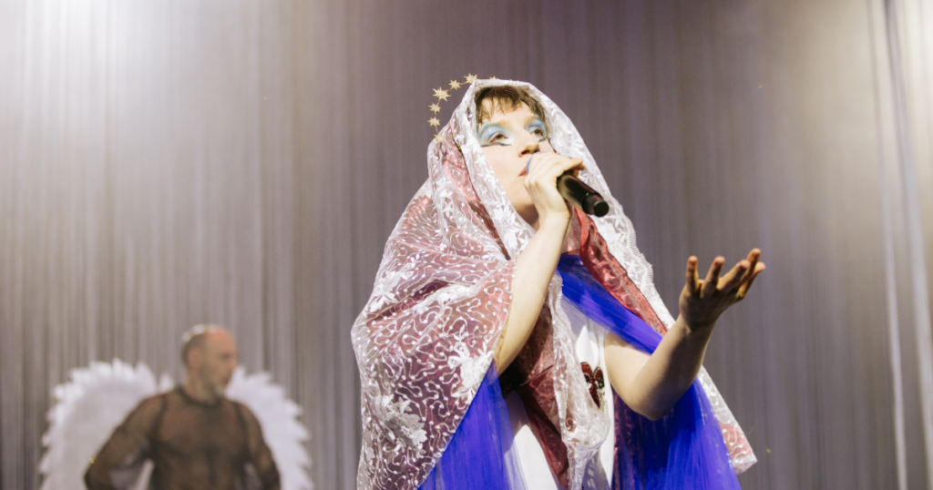 Und weil diese “religiöse Szene“ ihren Konter braucht, wird uns das auch sofort geliefert. Plötzlich wird es laut und die Performance mit dem Song „It’s a Sin“ startet, in der visuell Themen wie sexuelle Selbstermächtigung und queeres Ausleben gefeiert werden.