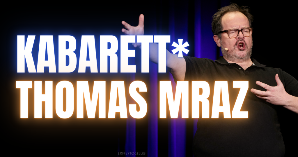 Ja, dieser Abend dreht sich wirklich in erster Linie um Thomas Mraz. Das ist fürs erste Programm tatsächlich abendfüllend. Auch, weil er hier neben spannenden Erzählungen eine tolle schauspielerische Leistung abliefert. Es bleibt die Frage: Wie wird er das später im zweiten Programm toppen? Vielleicht schließt er ja an die Schlusspointe vom Stützstrümpfe-Anziehen auf dem Flughafenklo an…